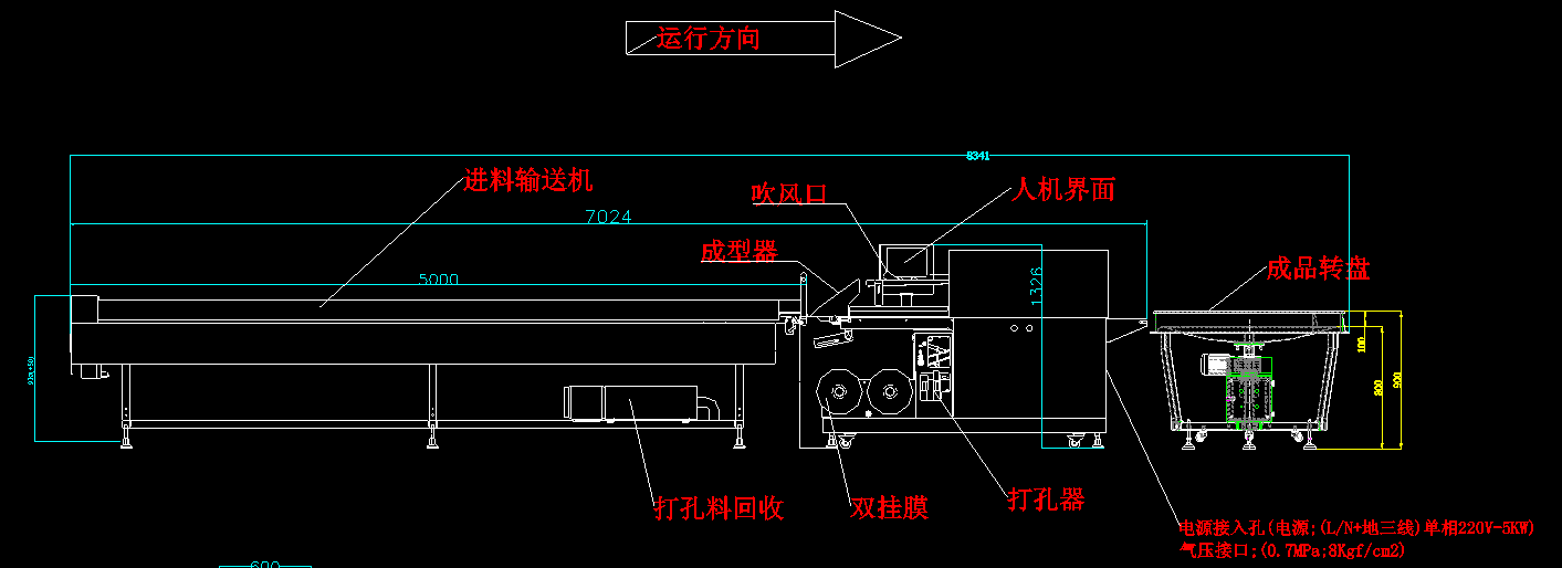操作流程:人工在工作臺把蔬菜放入輸入輸送機-》葉菜包裝機完成自動(dòng)打孔-》自動(dòng)裹膜è廢料收集-》制袋成型-》橫封封切-》成品輸出-》進(jìn)入旋轉接料盤(pán)
