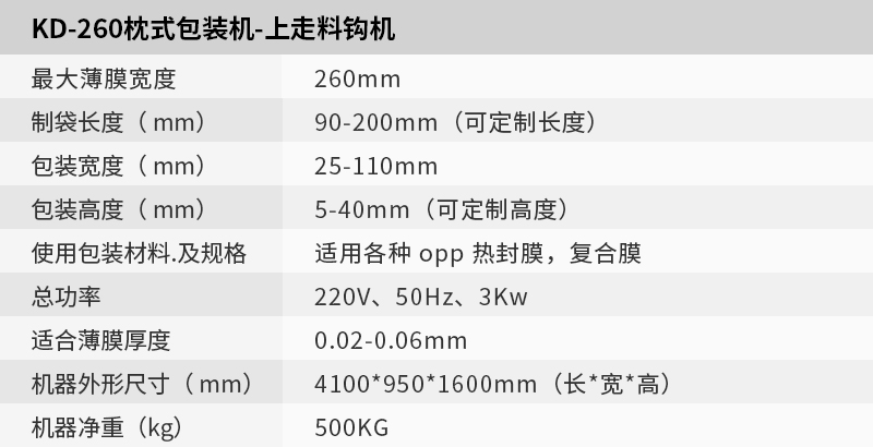 KD-260上走紙料勾枕式包裝機